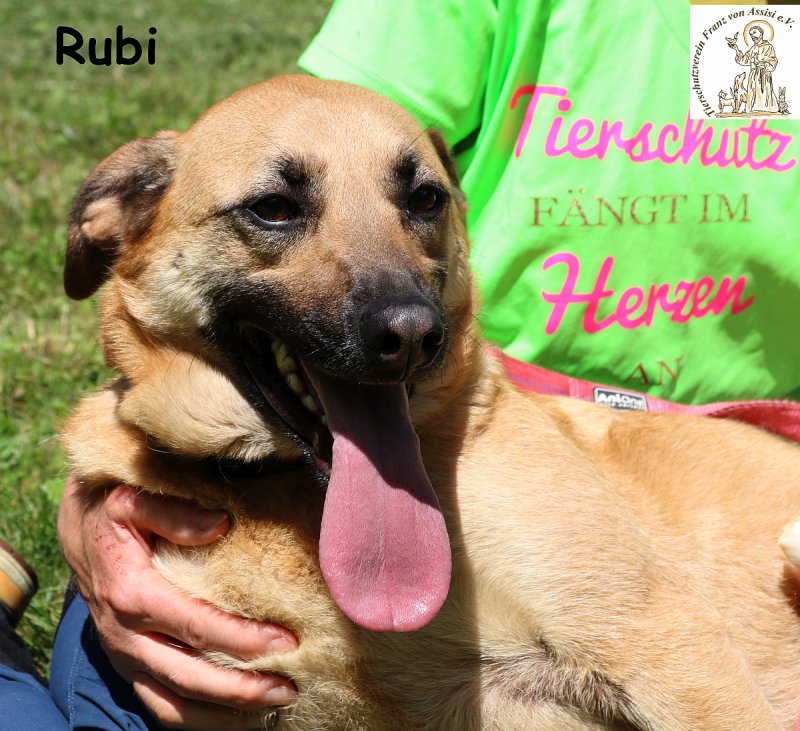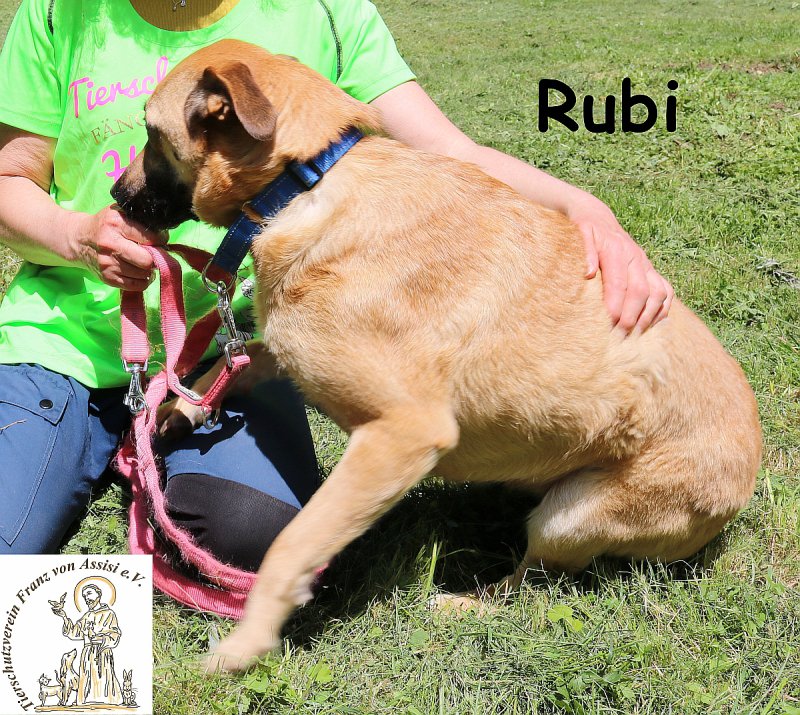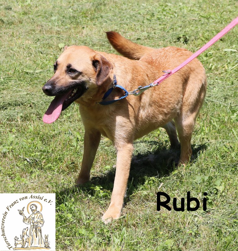 Ruby – ein echtes Goldstück auf vier Pfoten! Nicht nur, weil ihr Fell in einem warmen hellbraun-gold Ton schimmert, sondern weil sie auch innerlich strahlt. Diese junge Hundedame hat eine wunderschöne Zeichnung im Gesicht, die ihr einen ganz besonderen Ausdruck verleiht – fast so, als würde sie immer ein bisschen lächeln.