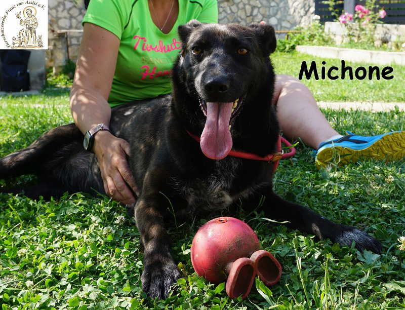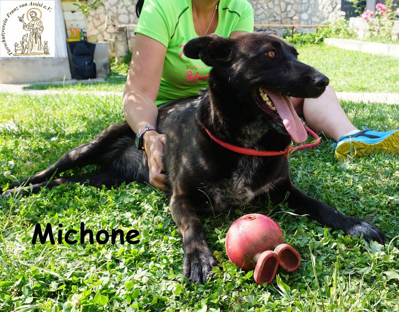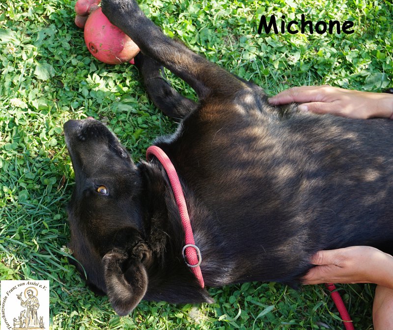 Michone ist eine junge, mittelgroße Hündin voller Energie, die das Leben einfach liebt. Wer sie einmal erlebt hat, kann sich ihrer Lebenslust kaum entziehen- sie strahlt, sie sprüht, sie steckt an! Ihr allergrößter Schatz, ohne den sie niemals ihre Reise nach Deutschland antreten würde, ist ihr kleiner rosa Ball. Dieses Spielzeug ist ihr Herzstück, ihr treuer Begleiter und das Highlight ihres Alltags. Michone bringt ihn mit voller Begeisterung zurück, immer und immer wieder – so zuverlässig und freudig, dass man ihr stundenlang zusehen könnte. Spielen ist für sie nicht einfach ein Zeitvertreib, es ist ihr größtes Glück.